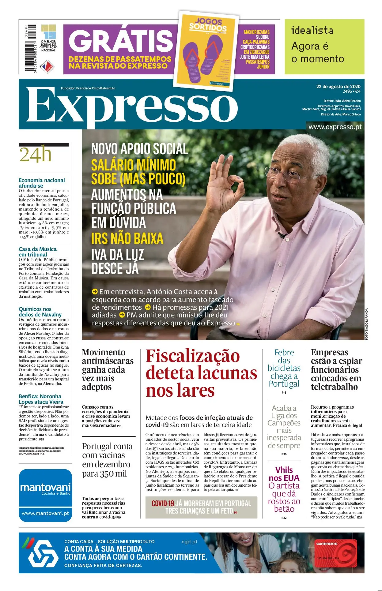 Já está disponível mais uma edição do seu semanário Expresso este sábado com destaque particular para a entrevista que o primeiro-ministro António Costa deu ao jornal e em que fez várias revelações sobre aquilo com que os portugueses poderão contar para os próximos meses em áreas tão delicadas e sensíveis como o IRS o salário mínimo ou os aumentos pretendidos pela.